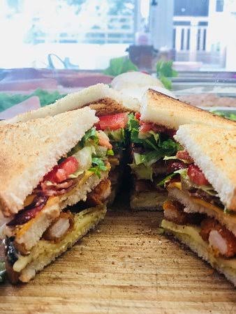 Two toasted pieces of Graham bread, with a layer of turkey or chicken and ham between them